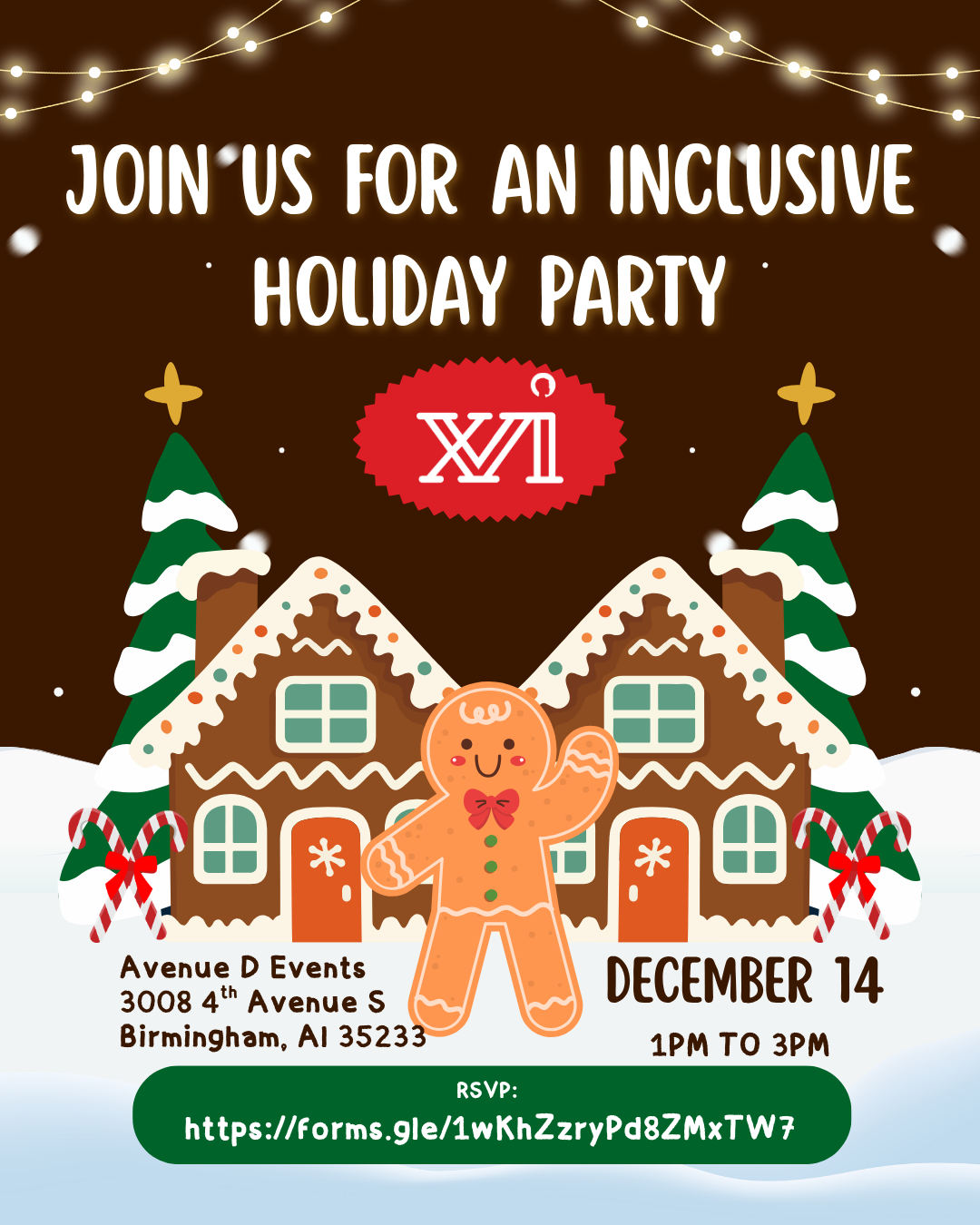 Inclusive Holiday Party Sunday, December 14, 2025 1:00 PM 3:00 PM Avenue D Events 3008 4th Avenue South Birmingham, AL, 35233 United States (map) Google Calendar ICS Please Register Here: https://forms.gle/oyfgbRjocCHMWa4LA